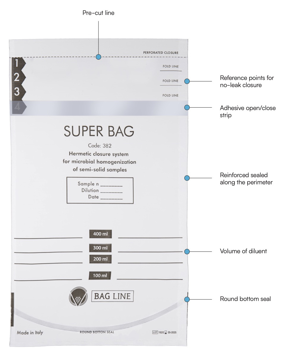 - on the bag there is a designated space where to write with a marker the amount of diluent used according to the weight of the sample